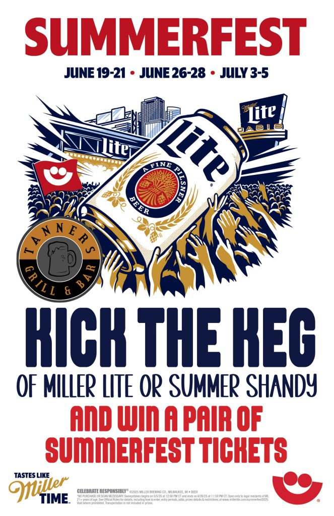 Now through July 4th, if you kick a keg of Leinies Summer Shandy or Miller Lite at Tanner’s Kimberly you win a pair of Summerfest Tickets! While supplies last
